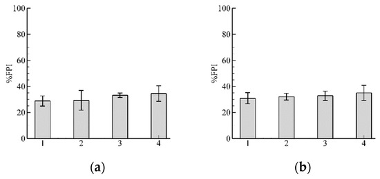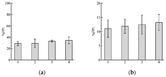 Results of fish passage index %FPI for and two different closest to fish position nodes: (a) and (b) . It is clearly seen that the mean values of %FPI do not change by increasing , which is reasonable, because guarantees that nodes closest to the current fish position are selected. From these results, we can make a conclusion that is sufficient to provide simulations of fish swimming. The numbers of the abscissa indicate bars with the same meaning as in Figure 7.