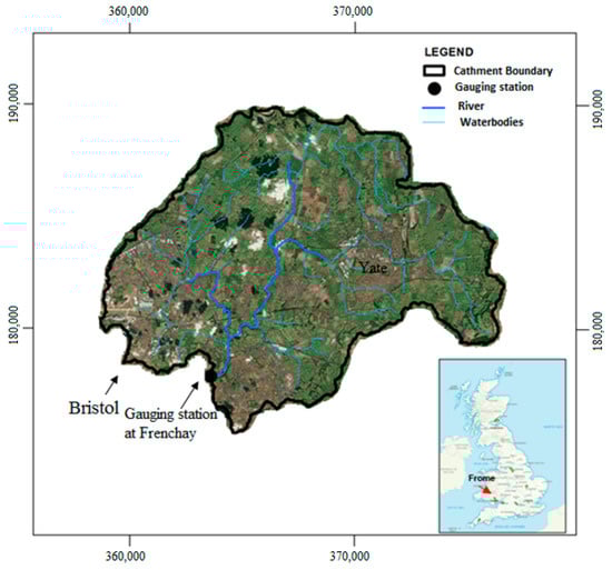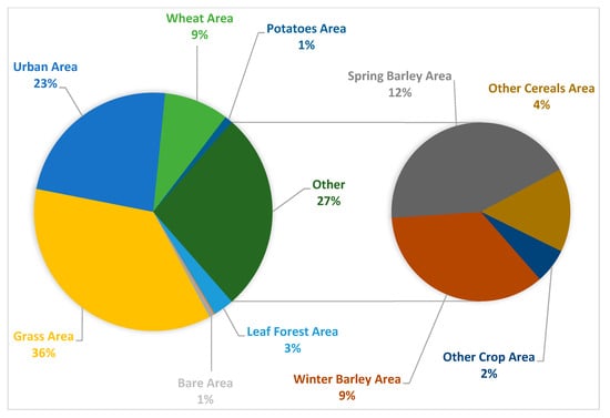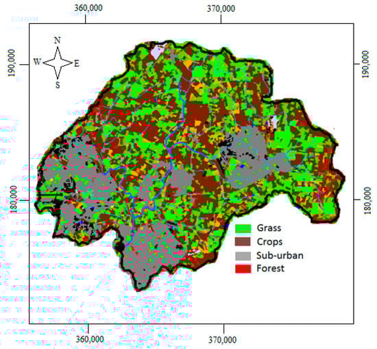 The catchment of the River Frome (National River Flow Archive (NRFA) reference 53006) was selected for this study. It is in south Gloucestershire, in the South West Region of the UK; the catchment’s area is 148.9 km2. The River Frome flows in a south westerly direction towards Bristol and the gauging station is at Frenchay (Figure 1). The mean annual rainfall of the catchment is around 792 mm, and the river flow is dominated by rapid surface runoff [15]. The studied catchment is of complex geology, as the eastern and central parts of the catchment are dominated by sandstone of the Coal Measures and Mercia Mudstone, while west of the catchment is less permeable. Superficial deposits are meltwater gravels and terraces, mainly in the west. The main land use practices of the catchment are grass land, crops and urban development (Figure 2). A more detailed land use is given in Figure 3: 36% of the catchment area is grassland, 23% is urban, 9% winter wheat, 12% spring barley, 10% winter barley, 3% forest, 4% other cereals, 1% potato, 2% bare soil and other crops.