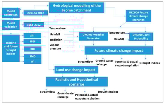 In the UK, reservoirs refill and groundwater is replenished during the November–April period when evaporation losses are minimal. A decrease in the rainfall, more particularly during the spring months, would put water supplies under pressure, particularly the lowlands of the country where groundwater is the principal source of water supplies [6]. The severity of drought events of recent years suggest an increased likelihood of these events in the future. The modelling study predicted an increase in temperature which will result in drier summers and wetter winters, and that would likely cause a reduction in water resource availability [9]. Climate change could have significant impacts on water supply systems and this is of more concern for England and Wales where the groundwater accounts for over 35% of the water supply [10]. Although a number of historical drought events have been studied across the UK [4,5,11,12,13,14], they have mainly focused on the events themselves, while less attention has been given to finding a number of drought indices which could represent all meteorological, hydrological and agricultural droughts under current and future climatic/land use change. Although some of the studies applied a modelling approach to study the severity of future droughts, a little work has been done to study the impacts of climate change on the drought at catchment scale under current and future climate and land use change scenarios. This is the aim of the current study.