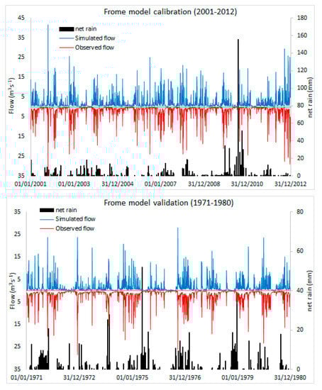 Relationship between the observed and simulated daily flow of the River Frome in Bristol.