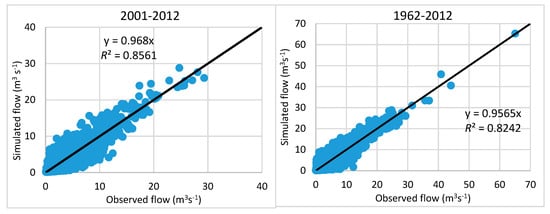 The model calibration was carried out over 12-years, with the most recent data (2001–2012) and the validation period varying from a number of years to the entire available record. To determine the model efficiency/goodness of fit, the simulated and observed flow data were compared using a number of indices, including the NSE coefficient based on [25]. NSE is the most widely used coefficient to assess the performance of hydrological models [26]. An NSE coefficient of 100% indicates a perfect match.
