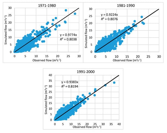 In addition to the rainfall, another key climatic variable which affects the water balance, including surface runoff and streamflow, is the temperature and its impact on water losses by evapotranspiration. An example of the daily Frome evapotranspiration is shown in Figure 6, which illustrates the simulated actual evapotranspiration during the 1992–1994 period. The figure shows that actual evapotranspiration, as expected, is higher during the summer months (June, July, August) when rainfall was lower, and temperature was higher than in other seasons. The correlation between the observed and simulated flow of different time periods is shown in Figure 7. The figure shows the model capability to reasonably predict stream flows both during the model calibration and validation periods. The correlation between the observed and simulated flow shows that the model performed equally well during the extremely dry and wet events. Model validation over 10-year sub-periods helped to find model performance during the drought i.e., the 1970s, and wet periods of the 1990s. The model results revealed a good agreement between the observed and simulated flows during both the dry and wet decades.