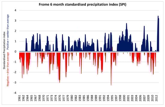 The SPI is the most commonly used drought index and describes the deviation of the precipitation from the average precipitation. The SPI index scale values mean: above 2.0 extremely wet, 1.5–1.99 very wet, 1.0–1.49 moderately wet, −0.99 to 0.99 near normal, −1.0 to −1.49 moderately dry, −1.5 to −1.99 severely dry and −2.0 and less, extremely dry [34]. A number of studies including [38] in Cyprus, [39,40] in Greece used the SPI index, while [41] used the SPI index to manage the drought in transboundary watersheds between Iran and Iraq. The SPI index was calculated over six months which helps to identify any short drought event. This is well evident from the fact that the SPI index picked up all the drought events that took place in the Frome catchment between 1961 and 2012 (Figure 8).