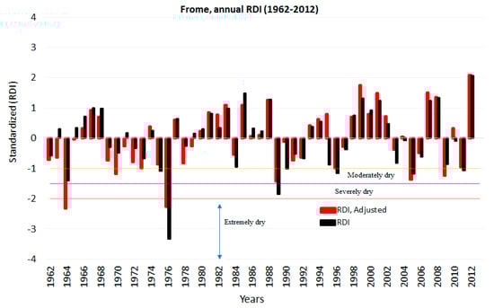 The other drought index that was considered in the study was the Reconnaissance Drought Index (RDI) which uses the ratio of total rainfall to total evapotranspiration of a period to represent the hydrological system input/output balance. Should the output (losses) exceed the input, drier conditions and eventually drought would occur. In this study, an attempt was also made to use the actual evapotranspiration and net rainfall to calculate the Adjusted RDI. The RDI index also picked up all the drought events which were observed by the SPI drought index. However, the advantage of applying RDI drought index is that it does not rely only on one factor, i.e., precipitation as it calculates the index using the rainfall relationship to the evapotranspiration and therefore implicitly incorporates the important influence of meteorological variables, such as temperature. Figure 9 shows the comparison between the RDI, and the Adjusted RDI. The Adjusted RDI showed slightly different severity levels, as its input in terms of rainfall (net rain) is less than the input to RDI (total rainfall) and output is also less (actual evapotranspiration) than the RDI (potential evapotranspiration) especially during extreme drought events. Figure 8 and Figure 9 show a strong trend resemblance between the RDI and the SPI. Figure 8 and Figure 9 show that extreme drought conditions were observed in 1976 as SPI and RDI both reached a low value of −2 under both types of RDI. Drier than average spells (SPI or RDI less than −1) were also observed in 1964, 1989, 1996, 2005, 2009 and 2011.