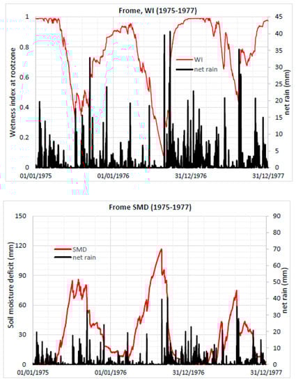 Wetness Index (top) and soil moisture deficit (bottom) of the root-zone for the Frome catchment during 1975–1977 drought period.