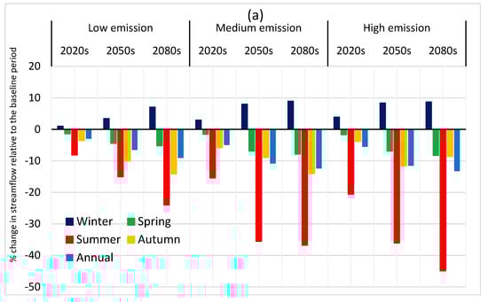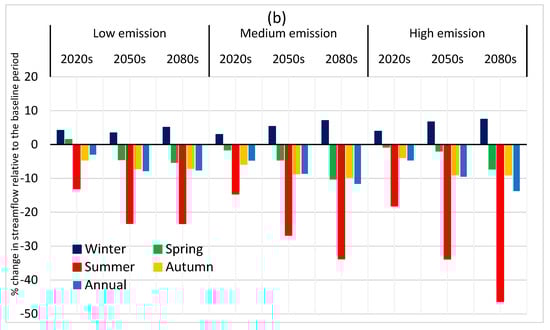 The streamflow projections under both the simplified change factors provided by the joint probability and the weather generator data suggest that the streamflow is likely to be reduced under all emission scenarios, except during winter when the streamflow is likely to increase by 9% in the 2050s and 2080s under medium and high emission scenarios, the increase under low emission in the 2080s would only slightly below 9% (Figure 11). A lower increase of 4 to 5% is projected for the 2020s under medium and high emissions; during the 2020s, the increase would be approximately 1%. During spring, the river flow is likely to decrease and the highest decrease in projected for the 2080s under high emission scenarios when river-flow could decrease more than 10% in comparison with the baseline period. Overall, an annual decrease in streamflow was observed under medium and high emission scenarios in the 2080s in comparison with the baseline period (1961–1990).