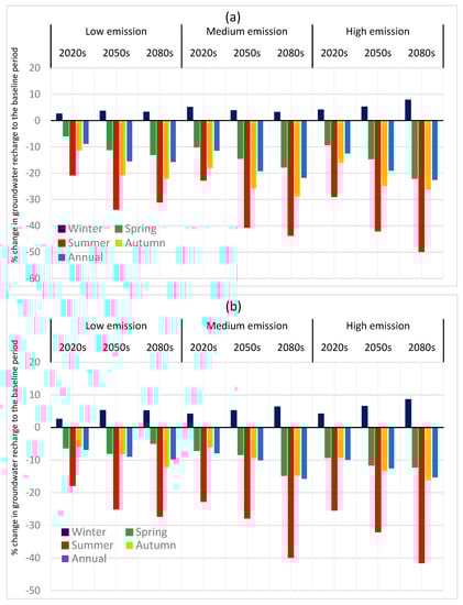 During the spring season, under all emission scenarios, a likely decrease in groundwater recharge is projected for all selected time periods. This decrease is likely to continue during the summer months due to the expected low summer precipitation and increasing temperature, which could lead to a decrease in groundwater recharge by up to 50% under high emission scenarios of the 2080s when using joint probability data of the UKCP09 data, albeit the percentage change in groundwater recharge was not that high when using the UKCP09 weather generator data. Such a significant decrease in groundwater recharge is the result of increased soil moisture deficit. Herrera-Pantoja and Hiscock [42] reported that the drier summers could lead to increased soil moisture deficit extending into the autumn and could shorten the winter recharge season. Overall, an annual decrease in groundwater recharge was observed under all emission scenarios, this decrease was slightly higher under medium and high emission scenarios in the 2080s in comparison to the baseline period. This decrease in winter groundwater recharge could be balanced by the increased winter precipitation as projected under all emission scenarios, as shown in Table 1. The future increase in winter precipitation is expected to come as extreme events and over a short period of time, as reported by Alexander et al. [43], and would result in reduced recharge. The results, shown in Figure 11, show that under all emission scenarios, the groundwater recharge is likely to decrease for all future time periods in spring, summer and autumn seasons. An increase in groundwater recharge during winter months is projected in the 2050s and 2080s; however, the increase is not that significant.