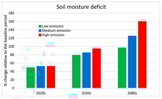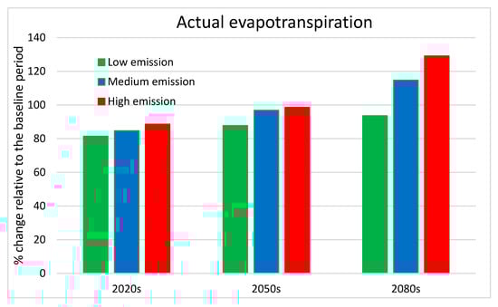 The use of the daily projected data of the weather generator with the DiCaSM model for the future time periods suggested a possible increase in SMD, and an increase in actual evapotranspiration. The highest increase in soil moisture deficit was 160% under high emission scenarios during the 2080s (Figure 13). This is due to the decrease in precipitation and increase in temperature that resulted in higher evapotranspiration. Under the high emission scenario, the results of the time period of the 2080s showed an increase of around 130% in evapotranspiration.