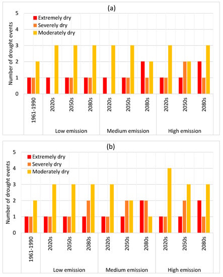 The RDI was calculated from the net rainfall and potential evapotranspiration of the selected time periods: 2020s, 2050s and 2080s for three emission scenarios. Like SPI index, the standardized reconnaissance drought RDI index scale values mean: above 2.0 extremely wet, 1.5–1.99 very wet, 1.0–1.49 moderately wet, −0.99 to 0.99 near normal, −1.0 to −1.49 moderately dry, −1.5 to −1.99 severely dry and −2.0 and less extremely dry [48]. Under low emission scenarios, the moderate drought events tripled in the 2050s and 2080s in comparison to the baseline period. This is possibly due to the mild and wet winters and drier and warmer summers, as shown in the Table 1. As projected for the low emission scenarios, a slight change in precipitation and temperature have led to drought severity level close to normal which is reflected in the higher number of moderate drought events (Figure 14). Under medium emission scenarios, the annual drought is considered severe as compared to the baseline period (1961–1990) and low emission scenarios. Under medium emission scenarios, the extreme drought events doubled in the later part of the century, in addition, more severe drought events were also projected in the 2050s and 2080s when using the weather generator data. This is due to the drier and warmer spring, summer and autumn seasons, leading to higher water losses by evapotranspiration combined with below average rainfall, both could result in extreme and severe drought events. The analysis under medium emission scenarios reveals that the severity of the drought will become more significant in the later part of the century.
