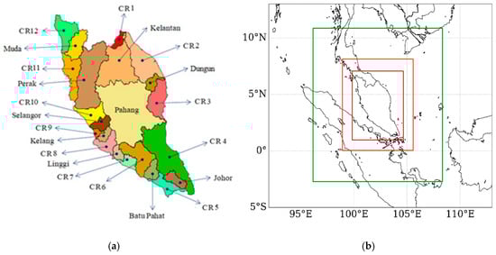 (a) 10 target watersheds and the remaining 12 coastal regions in Peninsular Malaysia (b) The modeling domains of Peninsular Malaysia hydroclimate model: The large outer domain shown by green box is covered by 54 km × 54 km grids; the intermediate domain shown by orange box is covered by 18 km × 18 km grids; and the inner modeling domain shown by red box is covered by 6 km × 6 km grids.