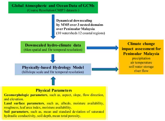 As Kavvas et al. [22] stated, modeling interactions between the atmosphere and hydrologic processes in heterogeneous domains are among the key problems in atmospheric and hydrologic sciences. Coupling land surface hydrologic processes with atmospheric processes is a necessity for accurate estimation of the land surface fluxes [22,23]. As such, a physically-based hydrology model, Watershed Environmental Hydrology Model (WEHY; Kavvas et al. [24]; Chen et al. [25,26]), and a regional climate model, MM5 (Fifth Generation Penn State/NCAR Mesoscale Model), were coupled in this study. Schematic description of the modeling approach is depicted in Figure 2. A unique feature of WEHY model is that it utilizes the upscaled hydrologic conservation equations which enable the estimation of the model parameters that are capable of describing the heterogeneity within the natural watersheds by taking into account areal averages, variances, and covariances of the original point-scale parameters [24]. This study extends the modeling approach utilized in Amin et al. [18], which assessed the impacts of climate change on river flows over Muda and Dungun watersheds, and reports the impacts of climate change on the hydro-climate (i.e., precipitation, temperature, soil water storage, and river flows) over the whole Peninsular Malaysia during the whole 2010–2100 period of the 21st century.