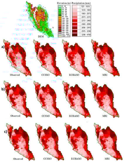 MM5-Simulated 10-year average annual precipitation during (a) 1970–1980, (b) 1980–1990, and (c) 1990–2000 by dynamically downscaling the control run data from CCSM3, ECHAM5 and MRI-CGCM2.3.2 global climate models, compared against observations.