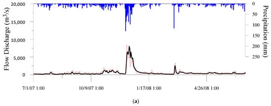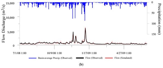 The calibration and validation of the river flow discharges, which are the ultimate product of the physical hydrology model coupled with the regional climate model, show credible stream discharge hydrographs in the study watersheds when compared to the corresponding observations. As an example, the hourly time series of the observed and model simulated stream discharges at Jambatan Guillemard station in Kelantan for the one-year calibration and one-year validation periods are depicted in Figure 4. The Nash-Sutcliffe coefficients are larger than 0.5 for all of the 10 watersheds both for the calibration and validation durations. Values of Nash–Sutcliffe coefficients that are typically greater than 0.5 are considered acceptable for the hydrologic applications [41]. Details of the calibration and validation process were discussed for Muda and Dungun watersheds in Amin et al. [18].