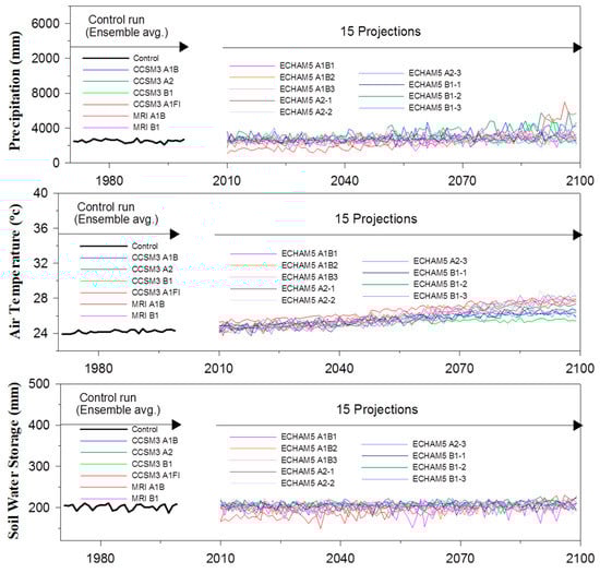 The assessment in this section is based on ensemble averages of the basin-average values of precipitation, air temperature, soil water storage, and river flow for the historical (1970–2000), the early 21st century (2010–2040), the middle 21st century (2040–2070), and the end of 21st century (2070–2100). As a demonstration of the variability of each of the 15 future projections, basin-average annual hydro-climate variables (i.e., precipitation, air temperature, and soil water storage) for each of the 15 projections during 2010–2100 are shown in Figure 5 for Kelantan Watershed.