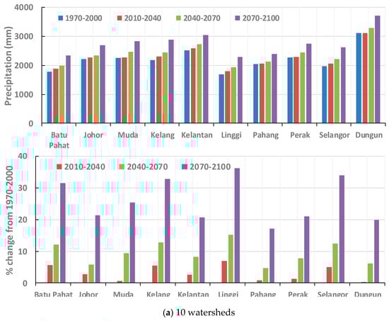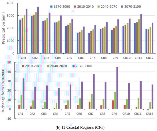 30-year mean of the basin-average annual precipitation in Peninsular Malaysia during the historical period, and through the 21st century. The percent changes are provided from the historical 1970–2000 period. (a) 10 watersheds; (b) 12 Coastal Regions (CRs).
