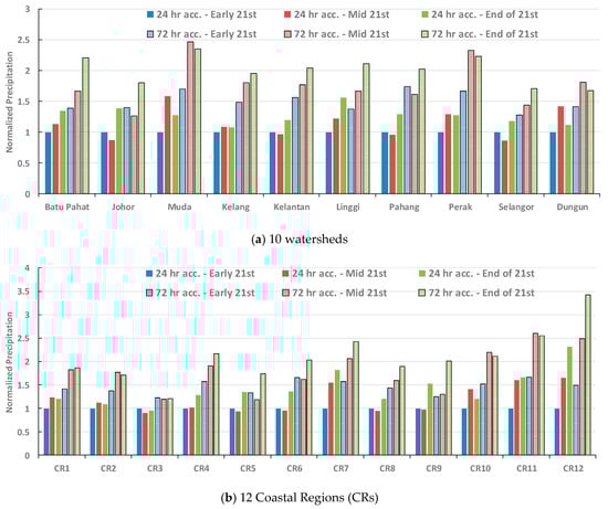 Normalized values of 24-h and 72-h accumulated precipitation for 100-year return period during the early, middle, and end of 21st century for the (a) 10 watersheds and (b) 12 coastal regions (CRs) of Peninsular Malaysia. Precipitation values are normalized with the 24 h accumulated precipitation value in the early 21st century. (a) 10 watersheds; (b) 12 Coastal Regions (CRs).