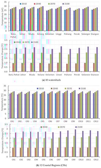 Basin-average annual mean air temperatures in water years 2010, 2040, 2070, and 2100, and the change in annual mean air temperature from water year 2010 to water years 2040, 2070, and 2100 in Peninsular Malaysia. (a) 10 watersheds; (b) 12 Coastal Regions (CRs).