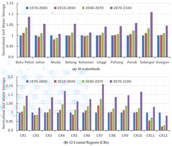Normalized values of 30-year mean of the basin-average annual mean soil water storage during the historical period (1970−2000) and through the 21st century for the a) 10 watersheds, and b) 12 coastal regions in Peninsular Malaysia. 30-year mean of the basin-average annual mean soil water storage values are normalized by the values of the 1970−2000 period. (a) 10 watersheds; (b) 12 Coastal Regions (CRs).