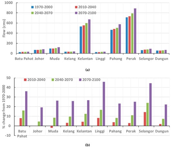 (a) The 30-year average annual mean flow during the historical period, and through the 21st century; (b) the change in the 30-year average of the annual mean flow from the historical period to the early, middle, and end of the 21st century for each of the 10 watersheds of Peninsular Malaysia.