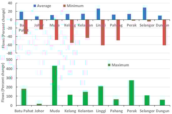 Percent change in values of the mean monthly river flows during the 2010–2100 period from those during the 1970–2000 period. The percent changes are calculated for average, minimum, and maximum mean monthly flows.