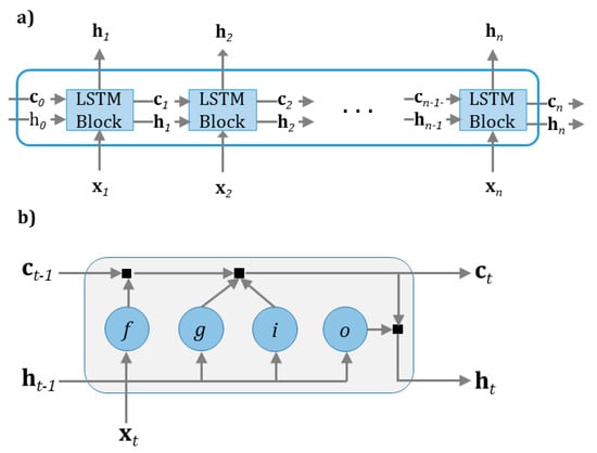 The classical LSTM block structure shown in Figure 2b consists of different processes called gates []. These gates compute the desired output from a new input data at a time , along with elements obtained from the previous time step .