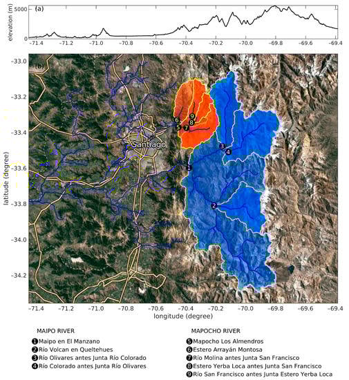 Región Metropolitana (33.5° S, 70.8° W, 500 m a.s.l.) is located in central Chile, in the Maipo river watershed, at the foot of the Andes Mountain that have an average height of 3000 m above sea level (m a.s.l.) and maximum height of 6500 m a.s.l. Two rivers coming from the Andes Mountains pass across region Metropolitana: Maipo river in the south, and Mapocho river in the north (Figure 3). These rivers come from the high mountains range, above 3500 m a.s.l, in an area covered by discontinuous permafrost, snow and glaciers. In this area, glaciers occupy near 8% of the total surface (Table 1), and it was estimated that nearly 10% of the rest of the detrital surface is occupied by debris-covered glaciers [].