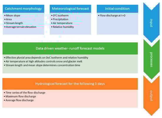 In Section 2.2, the hydrological description of the study area has shown that the Mapocho and Maipo rivers regime can be classified as a pluvio-nival regime during the autumn–winter seasons and a nivo-glacial regime during the spring–summer seasons. As a consequence, the variables for the weather-runoff model includes the standard variables in a rainfall-runoff model (precipitation, catchment area, stream length, slope), as well as air temperature and humidity as they define the contributing area and the rate at which snow and glaciers melt. Considering this, three different group of input information were used (Figure 4):