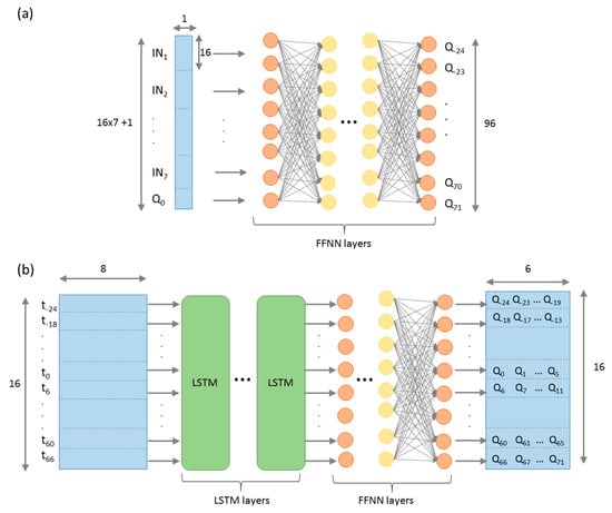 These forecast models aim to predict the flow time-series every hour based on the GFS weather data and the observed flow at t = 0. For doing this, the ANN model receives one vector of 113 inputs, corresponding to 112 GFS weather data (16 × 7) plus the observed flow at t = 0 (Figure 5a). The output is the predicted flow at t = −24, −23, …, +71, +72 h (96 outputs). The DL model, on the other hand, receives as input one 16 rows times 8 columns matrix, in which each row is associated with each one of the GFS times (t = −24, −18, …, +60, +66 h), whereas the columns contain the 7 input variables and the observed flow at t = 0, which is repeated on each row. The output is a 16 rows times 6 column matrix (Figure 5b), in which the first column contains the flow at times t = −24, −18, …, +60, +66 h, the second column the flow at t = −23, −17, …, +61, +67 h, and so on until the last column contains the flows at t = −19, −13, …, +65, +71 h. It is important to notice that the DL model was not used in the standard recursive way, in which the past time-series dependent variable (flow in this case) is recursively used as input for predicting the flows for the following time-steps. The proposed forecast model predicts at once the entire flow time-series for 1 day in the past and 3 days in the future with no need of the past flow. This constraint was required because the continuum real-time observations of the flow are not reliable, thus being necessary to only estimate the flow at t = 0 in case of failure of the real-time flow monitoring system. This is one of the novelties of this manuscript.