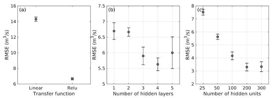 Root mean square error (RMSE) of a Maipo en el Manzano validation subset as a function of: (a) Transfer function for the ANN model, (b) the number of hidden layers, (c) the number of hidden units.
