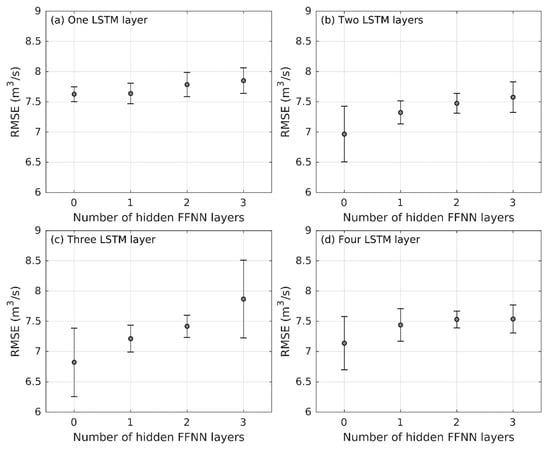 RMSE of a Maipo en el Manzano validation subset as a function of the number of LSTM and FFNN hidden layers for the DL model, (a) results for one LSTM layer, (b) results for two layers of LSTM, (c) results for three layers of LSTM, (d) results for four layers of LSTM.