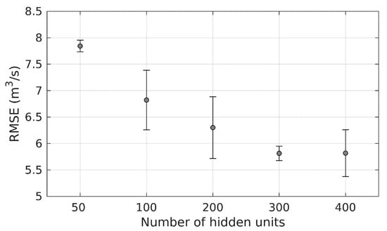 RMSE of a Maipo en el Manzano validation subset as a function of the number of hidden units in the LSTM layers for the DL model.