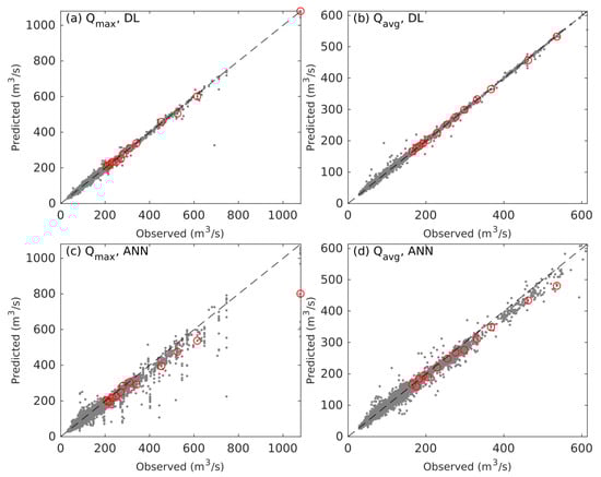 (a) Comparison between observed and predicted for flow station 1 and the DL model. (b) Same as (a) for the average flow . (c,d) same as (a,b) for the ANN model. Red open circles define examples plotted in Figure 11.