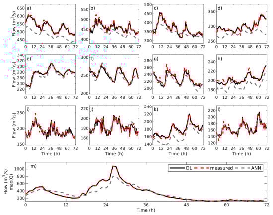 To evaluate the differences between the ANN and DL weather-runoff models, Figure 10 shows the direct comparison between observed and predicted maximum and average flow for the DL model ((a) and (b)) and the ANN model ((c) and (d)); using the test subset (the goodness of the fit is indicated in Table 5). The same figure for the rest of flow stations showed, in general, good agreement between predicted and observed maximum and average flows for both the DL and the ANN models, however, the performance of the DL weather-runoff model was better than the ANN model (see Figures S1–S8 in Supporting Information and Table 5). The normalized for the DL model were 5.9% and 4.3% for and , respectively; and were very close to 1, and the was 7.0 m3/s and 4.3 m3/s for and , respectively (see Table 5). With respect to performance in predicting the entire time-series of the flow for the following 3 days, Figure 11 shows the comparison between the observed and predicted flow for different cases identified with open circles in Figure 10. These examples were chosen based on the cumulative frequency of the average observed flow, using percentiles of 99.9%, 99.6%, 99%, 98%, 97%, 96%, 95%, 94%, 93%, 92%, 91% and 90%, for panels (a) to (l), respectively. Finally, Figure 11 compares predicted and observed flow time-series for the maximum flow event. Similar figures for the rest of the flow stations are found in the Supporting Information.
