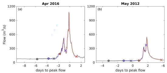 Time series of observed flow (grey line) for the events of (a) April 2016 and (b) May 2012 in Maipo en el Manzano station. Time series in black, blue and red are different predicted flows that star in the circle and ended with the x mark.