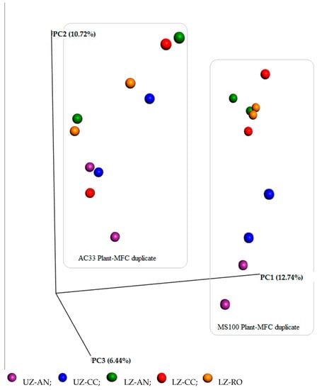 - Caporaso, J.G.; Kuczynski, J.; Stombaugh, J.; Bittinger, K.; Bushman, F.D.; Costello, E.K.; Fierer, N.; Peña, A.G.; Goodrich, J.K.; Gordon, J.I.; et al. QIIME allows analysis of high-throughput community sequencing data. Nat. Methods 2010, 7, 335–336. [Google Scholar] [CrossRef] [PubMed]