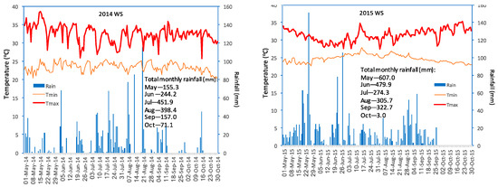 The total wet season rainfall was higher in 2015 (1993.0 mm) than in 2014 (1478.0 mm). Most of the rains occurred during the wet season (May–October), with about 89.3% and 73.7% of the total rainfall in 2014 and 2015, respectively. During the crop growth period (July–October), however, the total accumulated rainfall was higher in 2014 (1078.4 mm) than in 2015 (905.7 mm) as shown in Figure 1, where the highest accumulated monthly rainfall was observed in July (451.9 mm) during 2014 and in September (322.7 mm) during 2015. Mean daily maximum and minimum temperatures during the crop growth period in 2014 and 2015 were relatively similar during the same period (July–September), ranging from 27.5 to 35.3 °C (Figure 1). However, the mean daily minimum temperature was lower in 2014 (23.4 °C) than in 2015 (24.9 °C).