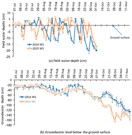 Average field water (a) and groundwater (b) level fluctuations in the study site during 2014 and 2015. Field water level fluctuations presented were the average of SA15 × SD1 × V1 plots, while average groundwater level was from the three groundwater observation wells installed in the site.