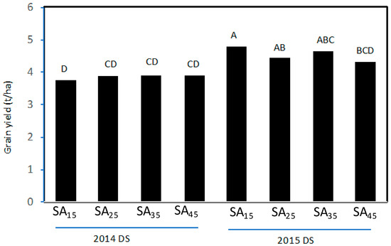 Comparing between years, grain yields were significantly lower in 2014 (3.9 t ha−1) than in 2015 (4.5 t ha−1). There was also a significant interaction between year and SA in the experiment (ANOVA results not shown). As shown in Figure 3, the highest value was observed in SA15 in 2014 (albeit not significantly different from the SA25, SA35 and SA45 during 2014, and SA45 in 2015), while in 2015, the highest value was obtained in SA15 (although not significantly different from SA25 and SA35 in 2015).