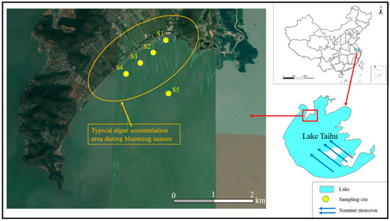 Lake Taihu (30°55’40”–31°32’58” N and 119°52’32”–120°36’10” E) is the third largest fresh water lake along the middle and lower reaches of Yangtze River, with an area of 2338 km2 and a mean depth of 1.9 m [37]. It is a typical large and shallow eutrophic lake with an algal bloom area that can engulf 75% of the lake during blooming seasons [38]. The northwestern area is the primary area for algae accumulation because of the serious pollution from the inflowing rivers and surrounding cities and the influence of the East Asian monsoon [38,39]. Lake Taihu is a drinking water source for the surrounding cities, including Wuxi and Suzhou. Every year, efforts are made to aid the recovery of the hyper-eutrophic lake. However, serious HABs and associated disasters such as the black water aggregation [25,40] are observed every year. During blooming seasons, the whole lake is odorous because of the presence of reductive sulfocompounds [41]. To investigate the development of sulfur in the water-sediment system of the algae accumulation area, a year-long field investigation was carried out quarterly in 2014 in Moon Bay, one of the most prominent algae accumulation areas in Lake Taihu.