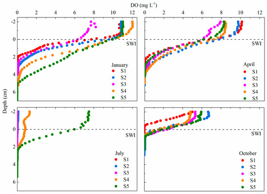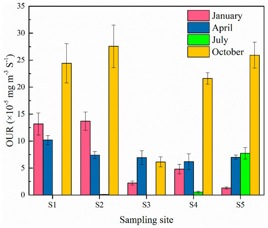 The OURs were calculated according to the DO profiles. From January to October, the OURs at the study sites generally increased (Figure 3). The OURs for sites S1, S2, S3, and S4 were at or nearly 0 mg m−3 s−1 in July, because there was nearly no oxygen across the SWI (Figure 2). The increased OURs from January to October indicated that there was an increased demand for, and depletion of, oxygen across the SWI, with the increased temperature and algal blooming. During the highest algal blooming season (July and October), the excessive accumulation of algae led to the death and deposition of algal particles on the surface sediments [43], consuming oxygen quickly and leading to the depletion of oxygen across the SWI [23,54]. Therefore, the OURs in October were much higher than those in January and April (Figure 3). The increased OURs and the associated depletion of oxygen across the SWI might influence the development of sulfur and other elements [25,40].