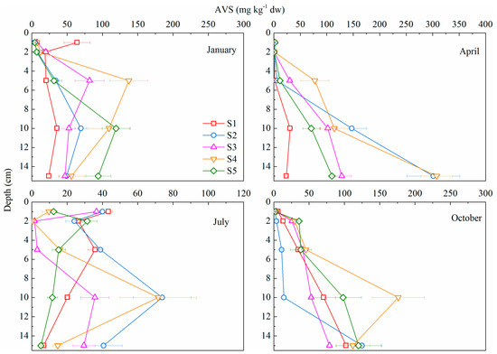 Acid volatile sulfide (AVS) profiles in the sediment during the field investigation period. Error bars indicate the standard deviation, n = 3.
