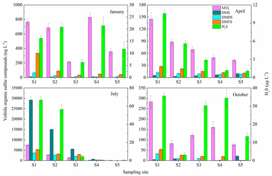 The concentrations of MTL, DMS, and DMDS in January, April, and October were under the odor-threshold concentrations (OTCs, 2.1, 1.0, and 4.0 μg L−1 for MTL, DMS, and DMDS, respectively, Figure 5) [61]. However, the concentrations of DMTS across the sites during these three seasons were higher than the OTC because of the low OTC of DMTS (0.01 μg L−1) [61]. The concentrations of MTL and H2S were noticeably higher than those of other VSCs during January, April, and October. The concentrations of all VSCs were much higher in July (summer) than those in the other three seasons (Figure 5). The concentrations of VOSCs in July were higher than those of OTCs, especially at sites S1, S2, and S3. The DMS concentrations at S1 and S2 were 20 times those of OTCs. Unlike the dominant forms of VSCs, such as MTL and H2S, in other seasons, the dominant VSCs in July were DMS and H2S. The differences in the DMDS (p = 0.040), DMTS (p = 0.036), and H2S (p = 0.040) concentrations were significant at different sites across the seasons, while those for MTL (p = 0.052) and DMS (p = 0.057) were not significant (analysis A4 in Table S1). A decreasing trend for VSCs was observed in July at sites S1 to S5, indicating a dispersal of VSCs from the littoral algae accumulation area to the open water. This phenomenon suggests that a close relationship exists between the algae accumulation and the VSCs present.