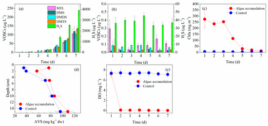 Development of the characteristics of the water-sediment system during the algae accumulation experiment: (a) Volatile sulfur compounds in the water during the algae accumulation; (b) volatile sulfur compounds in the control treatment; (c) the concentrations of chlorophyll a (Chla) in the water during the algae accumulation experiment; (d) profiles of acid volatile sulfide (AVS) at the end of the algae accumulation experiment; and (e) dissolved oxygen (DO) in the water during the algae accumulation experiment. Error bars indicate the standard deviation, n = 3.