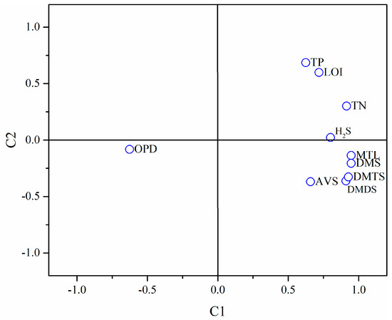 Principal component analysis (C1, C2) of the various characteristics of water and sediments for the field investigation period. OPD: Oxygen penetration depth; TP: Total phosphorus in the sediment; LOI: Loss on ignition in the sediment; TN: Total nitrogen in the sediment; AVS: Acid volatile sulfide in the sediment; H2S: Hydrogen sulfide in the water; MTL: Methanethiol in the water; DMS: Dimethyl sulfide in the water; DMDS: Dimethyl disulfide in the water; DMTS: Dimethyl trisulfide in the water.