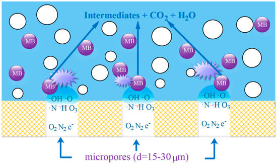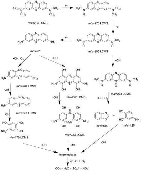 - Huang, F.; Chen, L.; Wang, H.; Yan, Z. Analysis of the degradation mechanism of methylene blue by atmospheric pressure dielectric barrier discharge plasma. Chem. Eng. J. 2010, 162, 250–256. [Google Scholar] [CrossRef]
