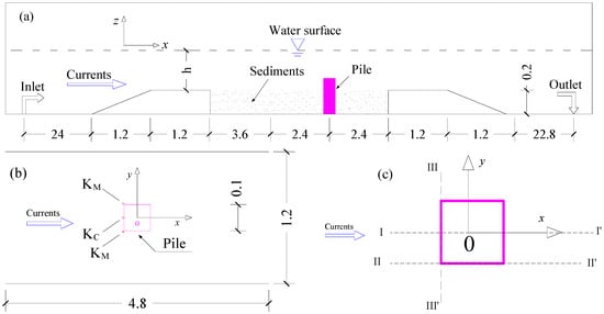 The experiments were conducted in a water flume that was 60 m long, 1.2 m wide, and 1.5 m deep in the Hydraulic Modeling Laboratory at ShanDong JiaoTong University, China. The open channel flume is equipped with a pump with a capacity of 0.64 m3/s. The currents were pumped from left to right and circled the pipeline. The test section was in the middle of the flume, as shown in Figure 1a. A slope of 1:6 was designed to decrease the unsteadiness of the flow when it was pumped. The test section was 8.4 m long, 1.2 m wide, and 0.2 m in height with a 7.2 m sediment bed in front of the pile to provide a stable boundary layer. As is seen in Figure 1b, a coordinate system, whose origin was in the center of the model, was established. The upstream corner point (KM) and upstream symmetry center point (KC) were defined, too. To avoid the contraction effect, the pile width was designed for less than 10% of the flume width [19]. In the process of the experimental tests, the bed profiles in Figure 1c were measured.