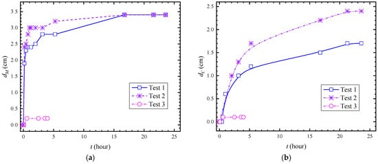 Under live-bed scour conditions, the maximum scour depth is often observed at the center of the symmetry pile [15,16,17]. Under clear-water scouring conditions, the maximum scour depth has usually occurred at the two upstream corners [13,18,24]. Knowing this, the evolutions of the key point scour depths (scour depths at KM and KC) were studied. As shown in Figure 3a, the averaged scour depths of the two upstream corners for the three piles increased rapidly in the first hour. Then, the scouring rate gradually slowed down. Finally, after 16 h of scouring for the SC piles (tests 1 and 2), the scour depth was kept at a constant value. The scour depths for the CC pile (test 3) in Figure 3a,b show a far smaller value compared to the SC piles. The three phases of the scour evolutions are in accord with those by [25]. However, due to the small scour depth, it is not obvious for the scour depth of the CC pile. This indicates that the more streamlined shape of the CC pile will be scoured far less than that of the piles with sharp corners. It should be noted that the maximum scour depths for the two SC piles in Figure 3a are the same at 3.4 cm, whereas the KC scour depth for the higher SC pile (test 2) is 41% larger than that of the shorter SC pile (test 1).