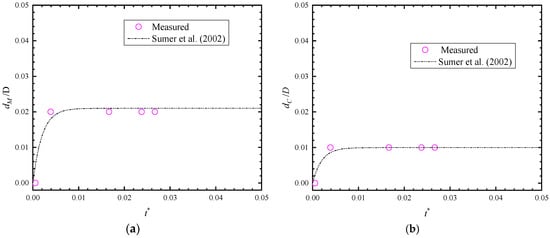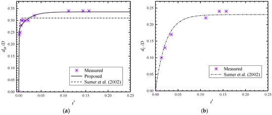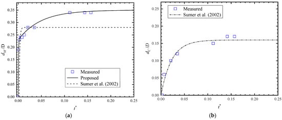 Similar to local scouring of the vertical piles in unsubmerged cases, the scour depth evolutions curves in Figure 3a,b appear to be asymptotic. To predict the scour depths over time, exponential functions were adopted, as described in the following section.