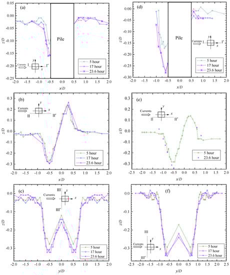 Before the topographies of the three tests were measured, the equilibrium states of the local scour experiments were determined. These determinations were the results of comparing the measured scour depth evolutions in Figure 3 and the evolutions of the bed profiles around the piles in Figure 7. For the SC piles of test 1 and test 2, the scour profiles aligned with the sections are almost coincident at 17 h and 23.6 h. For the CC pile of test 3, the scour depths were extremely small and little change was shown during a 4-h period. Judging from these data, the scouring and deposits around the piles were thought to be at equilibrium.