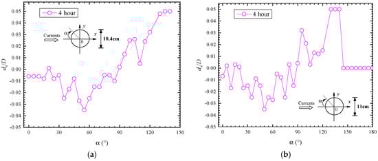 Scour depths close to the CC pile (test 3). (a) On a circle with a diameter of 10.4 cm; (b) On a circle with a diameter of 11 cm.